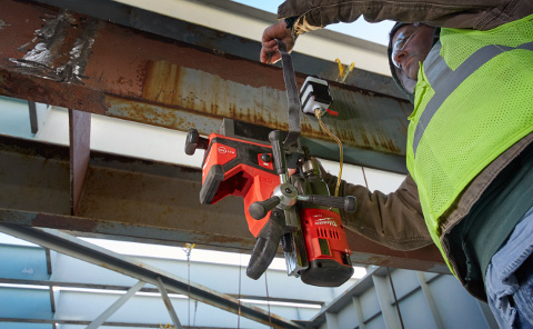 Core drill or hole saw since relatively large holes often have to be drilled in steel beams for screw connections.